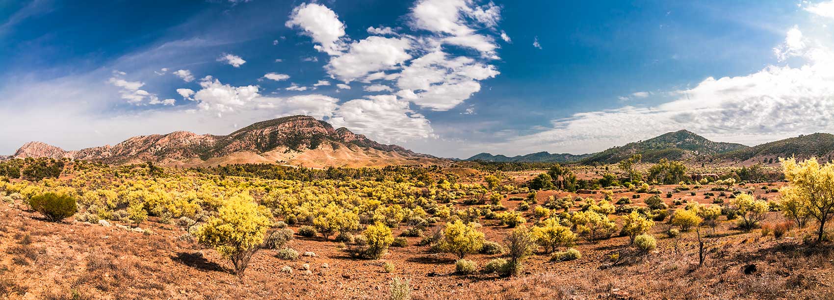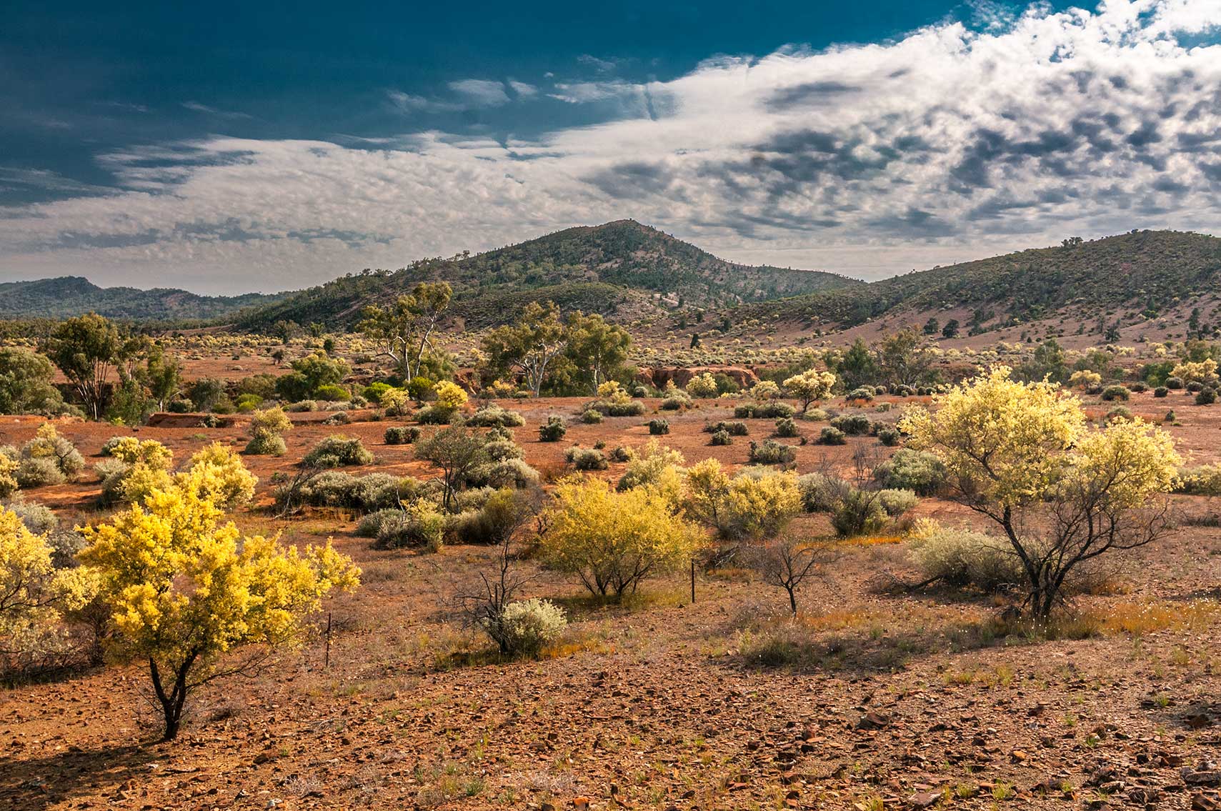 FLINDERS RANGES Aroona landscape with yellow Acacias in flower.