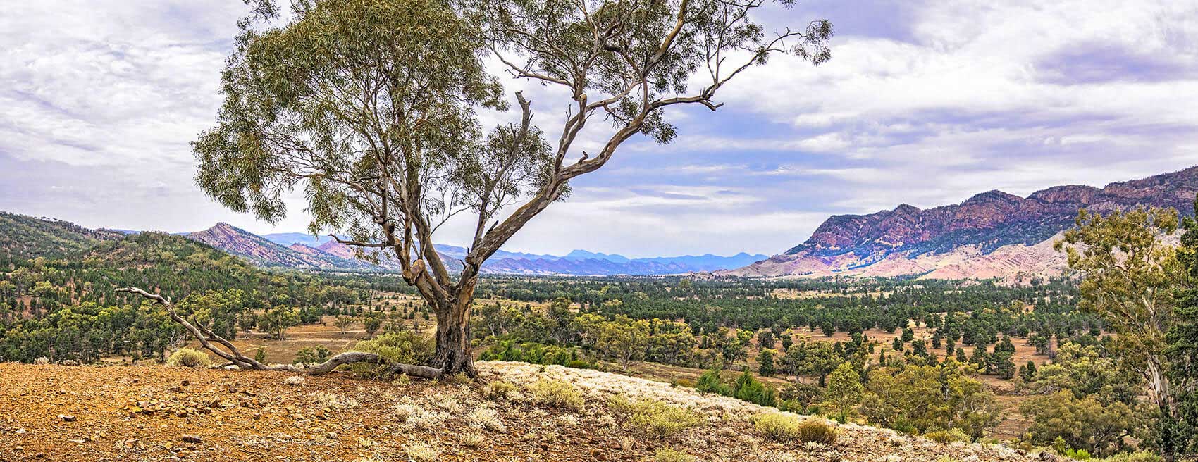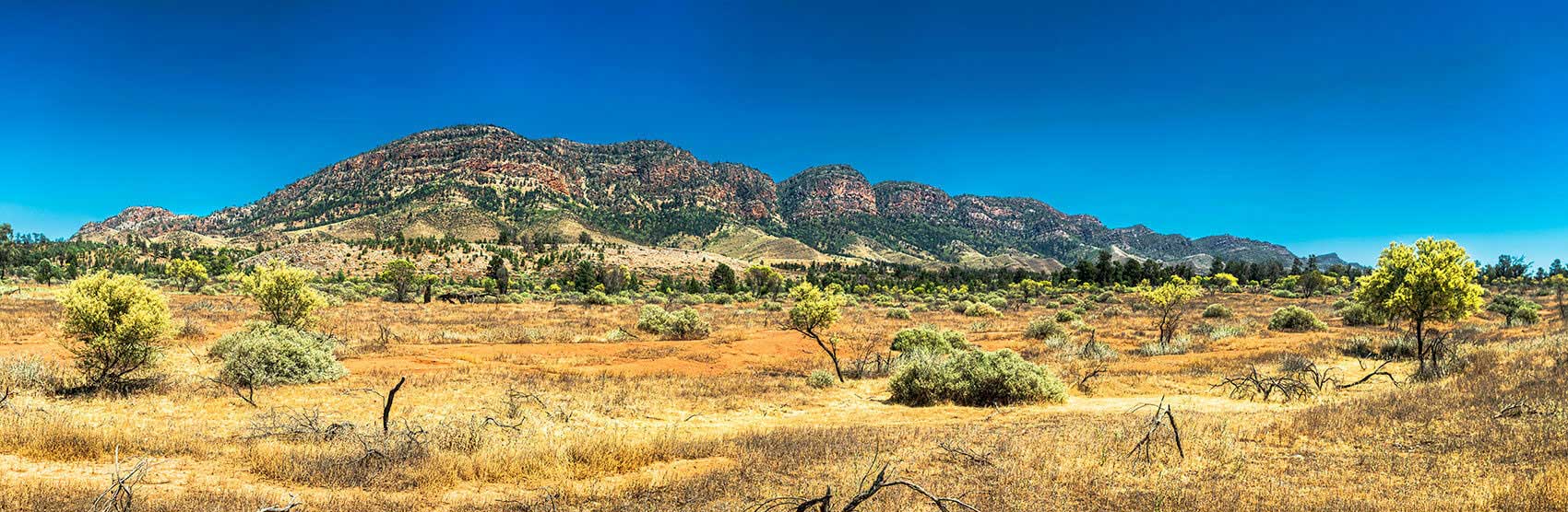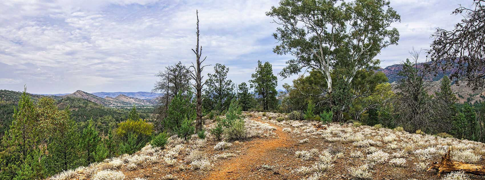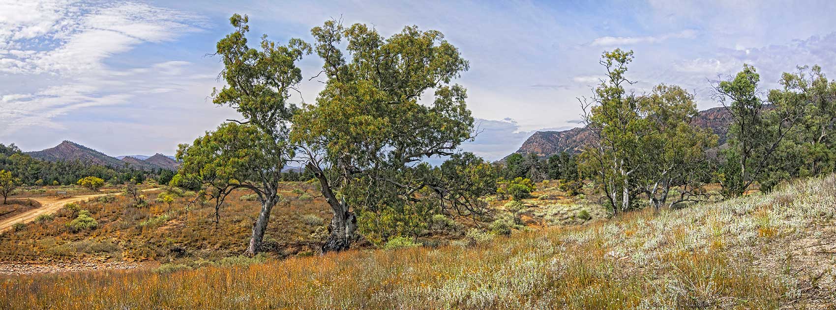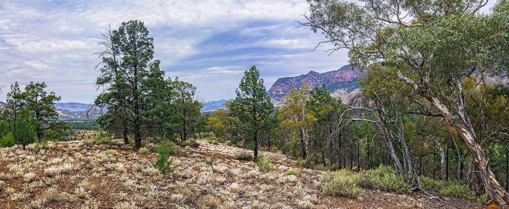 FLINDERS RANGES Aroona bush terrain. with trees and wildflowers.