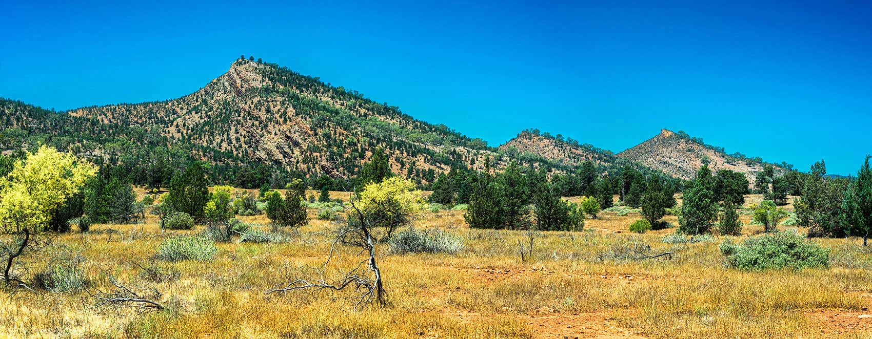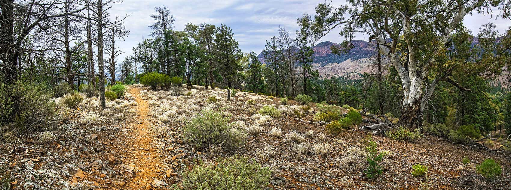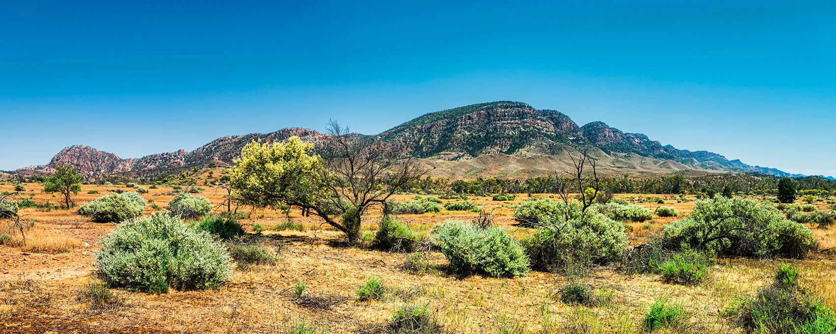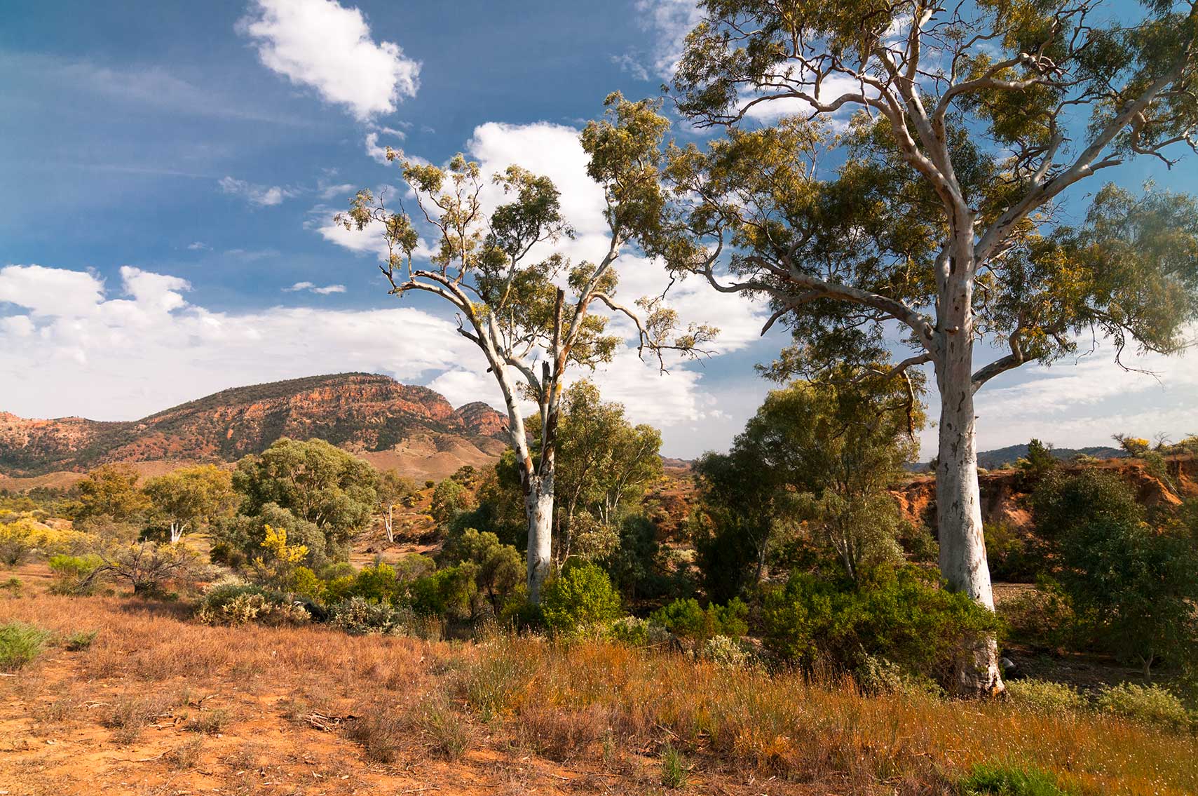 FLINDERS RANGES Aroona bush terrain. with trees and wildflowers.